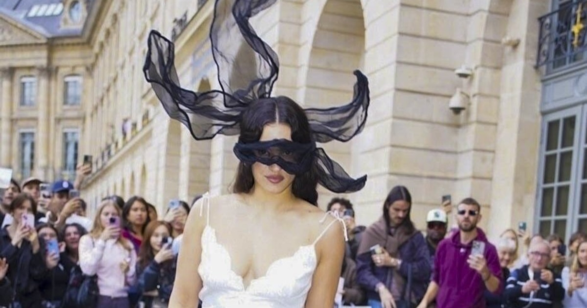 Durante la Semana de la Moda de París, Rosalía lució un impresionante vestido midi blanco complementado con un voluminoso abrigo de plumas blancas. La combinación de estos elementos no solo le otorgó elegancia, sino que también aportó un aire de teatralidad al evento. En esa misma semana, optó por un vestido largo de raso blanco con tirantes finos. La adición de un tocado escultórico y una máscara de tela negra translúcida llevó su apariencia a otro nivel, realzando la esencia performativa de su estilo.
